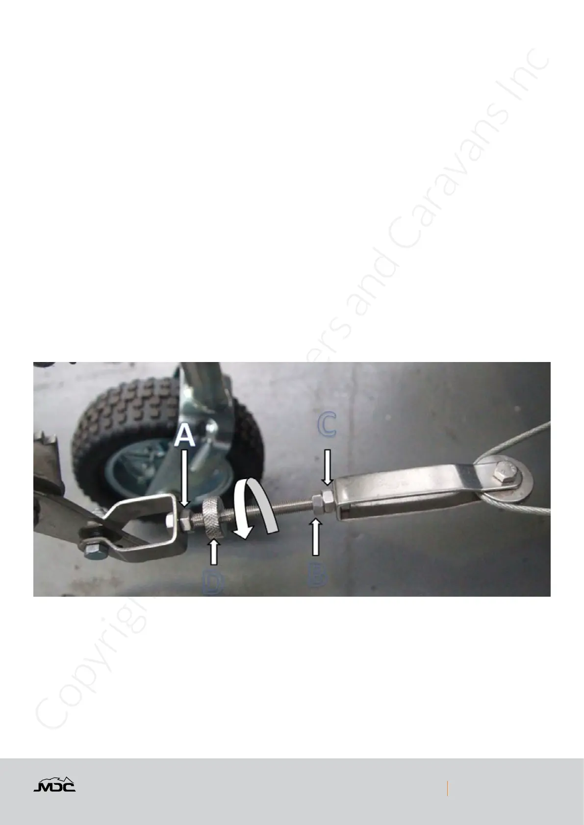 tighten the handbrake cable, turn the adjuster wheel D in a clockwise direction. Once adjusted retighten lock nuts