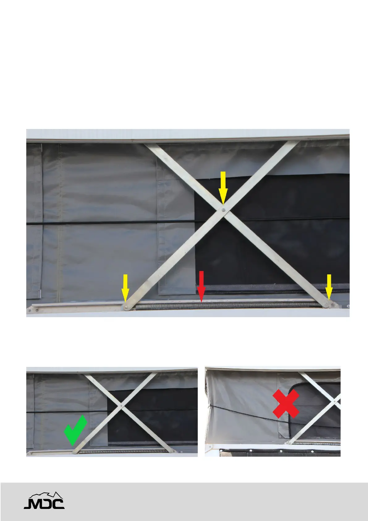 The elastic cord surrounding the PVC roof skirt is placed to ensure the skirt pulls inward when lowering the roof.
