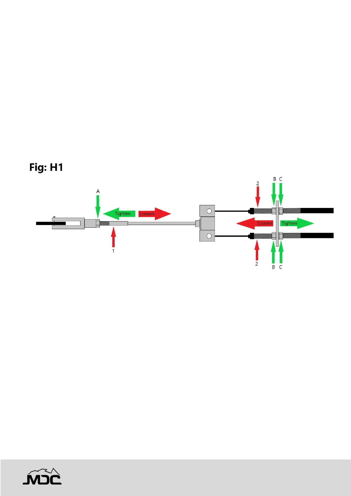 3. Turn locknut B clockwise towards the backing plate while loosening locknut C to reduce handbrake.
