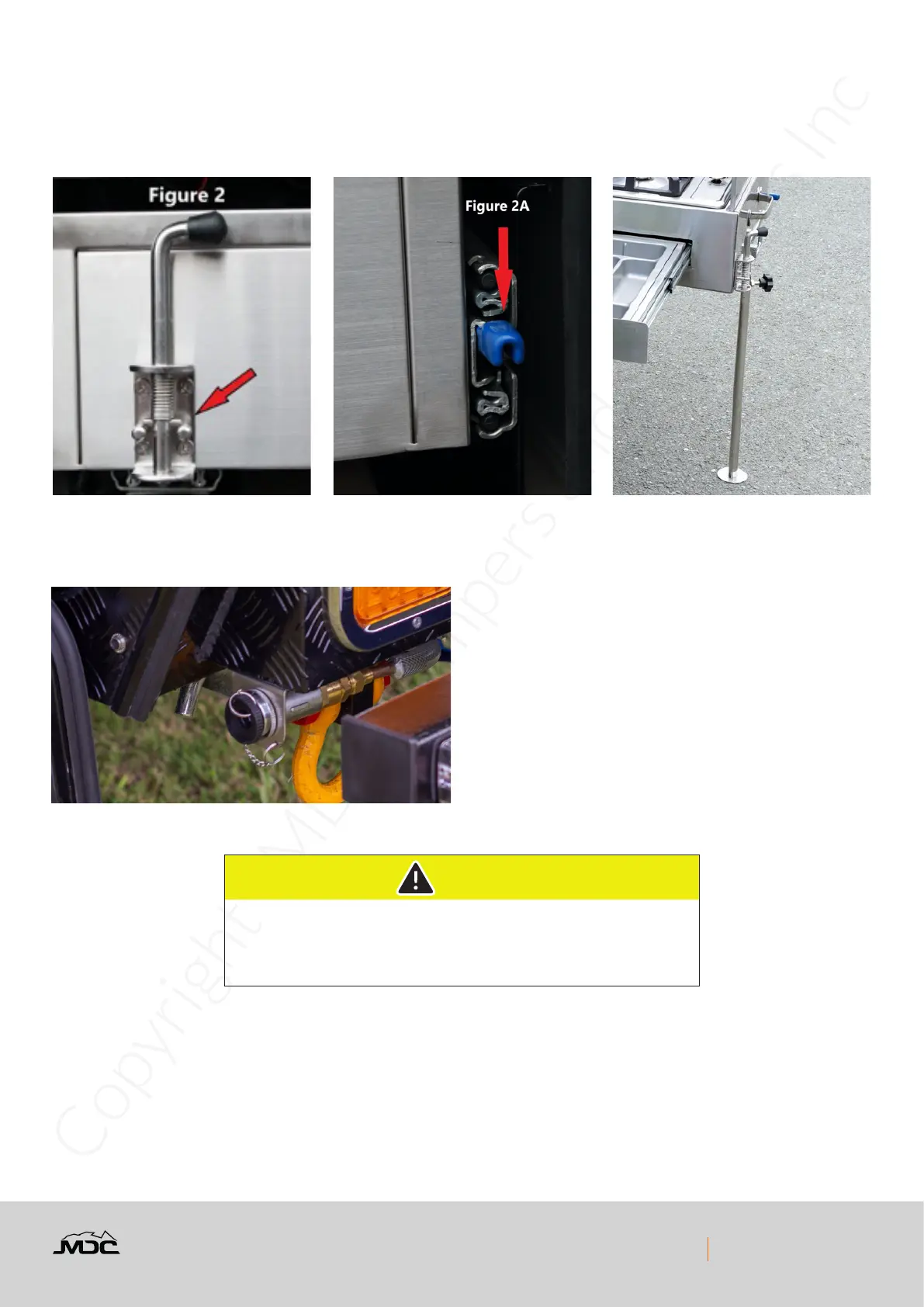To extend the kitchen from the caravan, press down the blue slide tab, raise the pad bolt and pull kitchen out. The