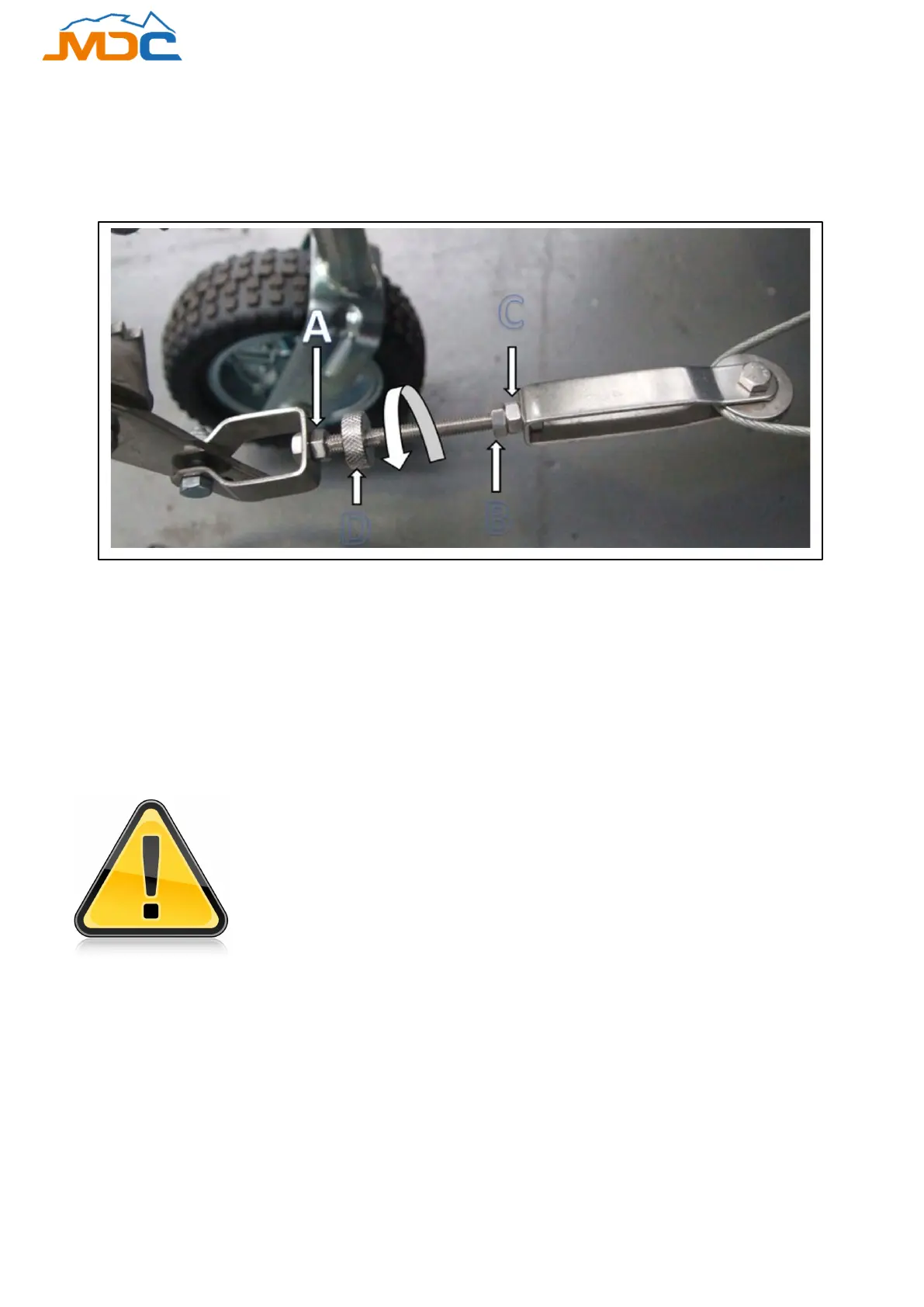 tighten the handbrake cable turn the adjuster wheel D in a clockwise direction. Once adjusted retighten lock nuts and