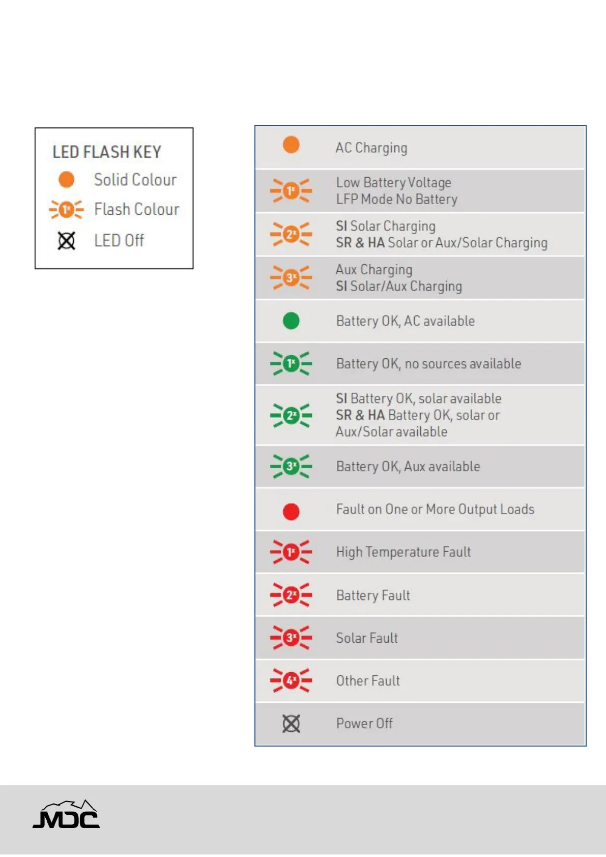 Table displays the operational status of the BatteryPlus35-II, as shown by the colored flash of the LED Status