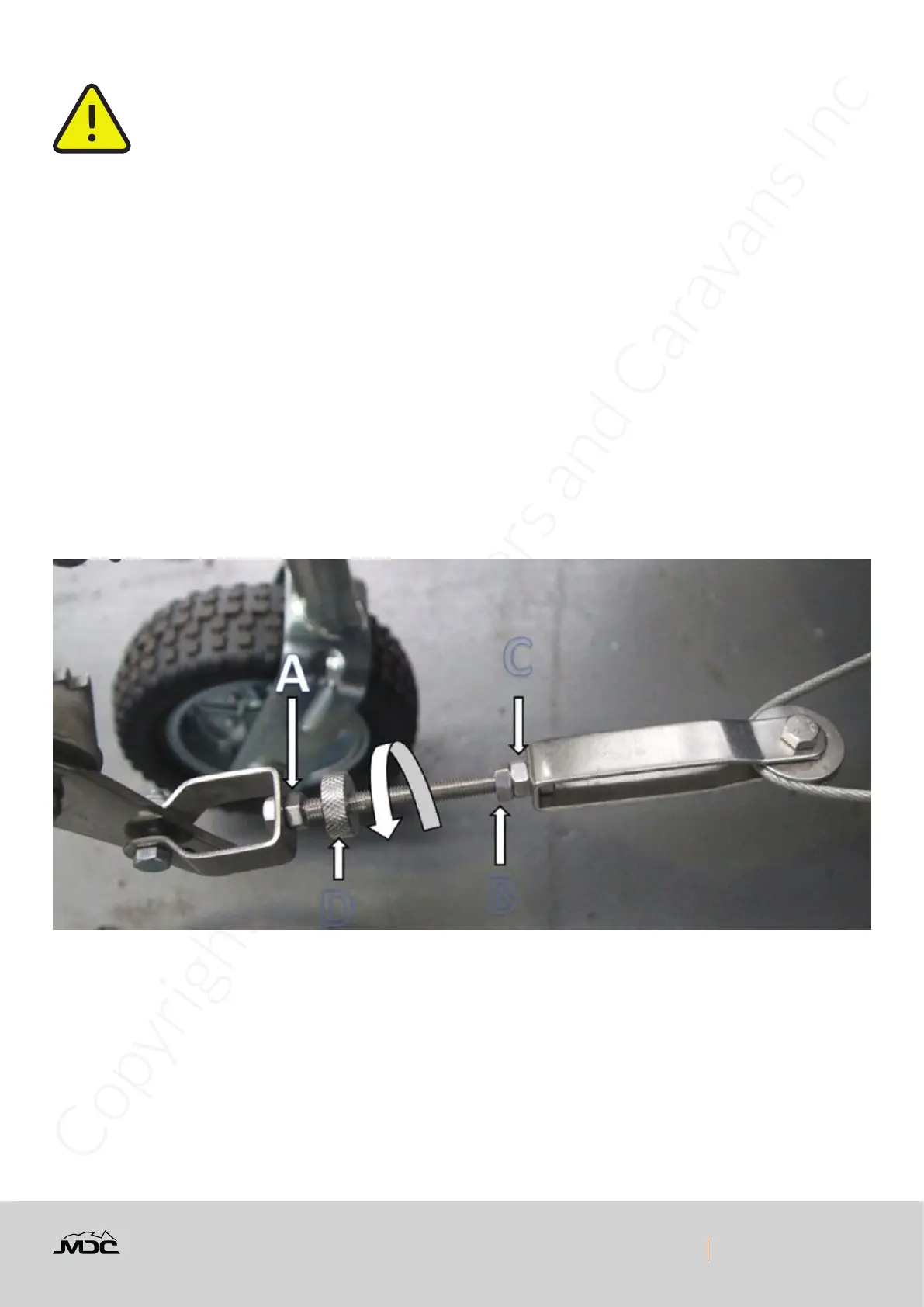 tighten the handbrake cable, turn the adjuster wheel D in a clockwise direction. Once adjusted retighten lock nuts and