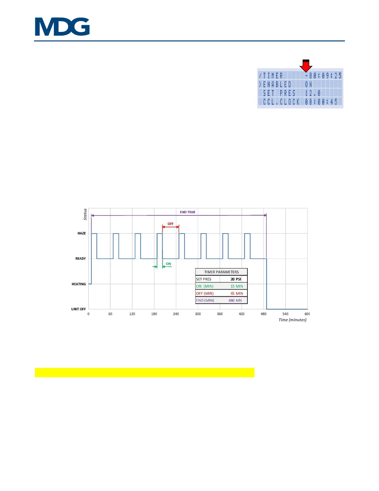 the generator was in a CYCLE ON phase, proceeding to a purge. When the TIMER is re-enabled, the TIMER
