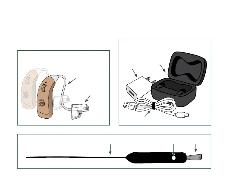 MDHearingAid VOLT+ - Package Contents; VOLT Hearing Aid(s); Charger; Cleaning Tool