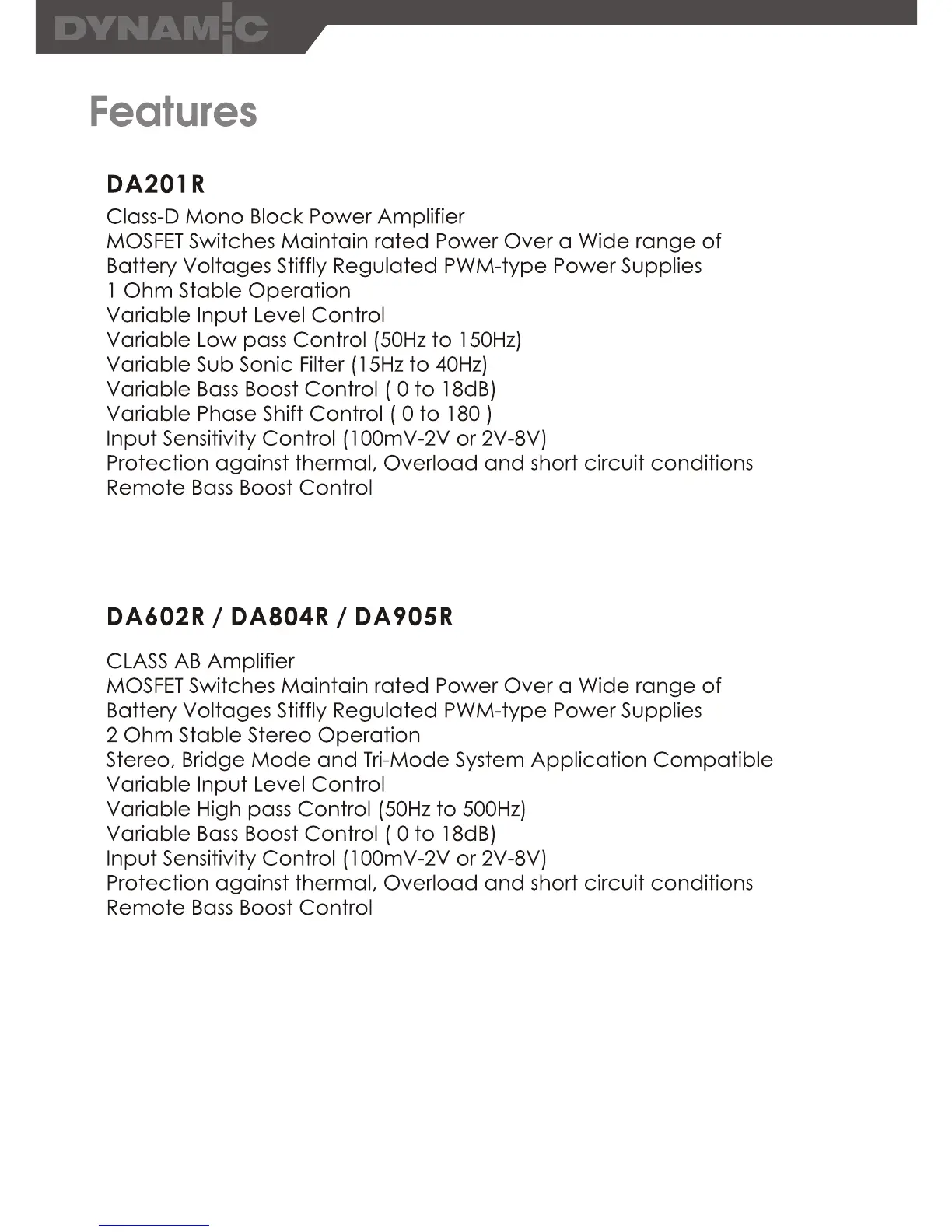 MDS DA201R - Features; DA201 R Amplifier Features; DA602 R, DA804 R, DA905 R Amplifier Features