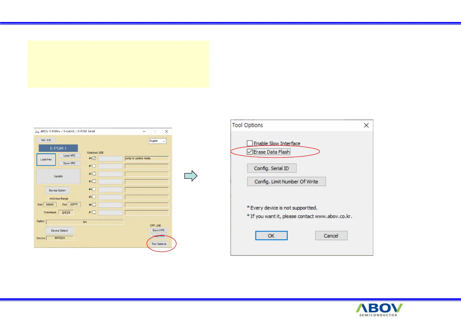 MDS E-PGM+ - Tool Options: Erase Data Flash; Data Flash Erasing during Write