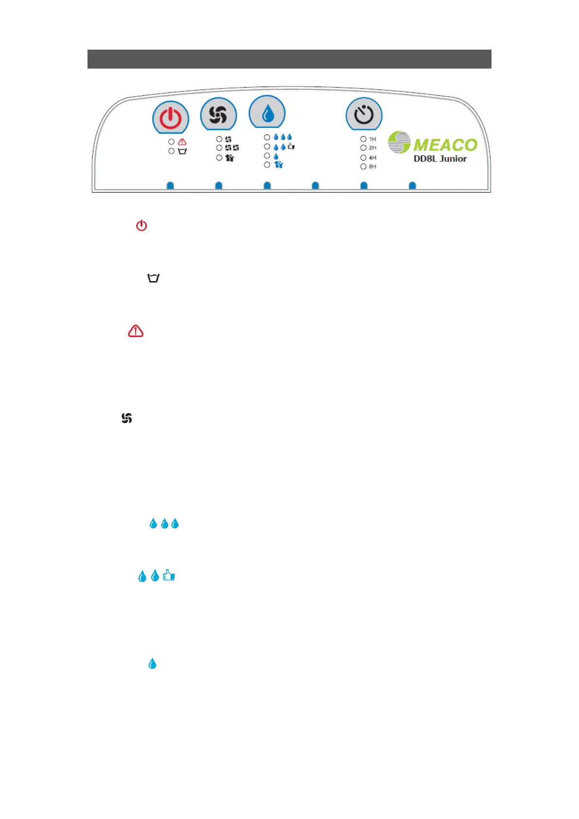 Power - Lights up when there is power to the dehumidifier, the unit bleeps three