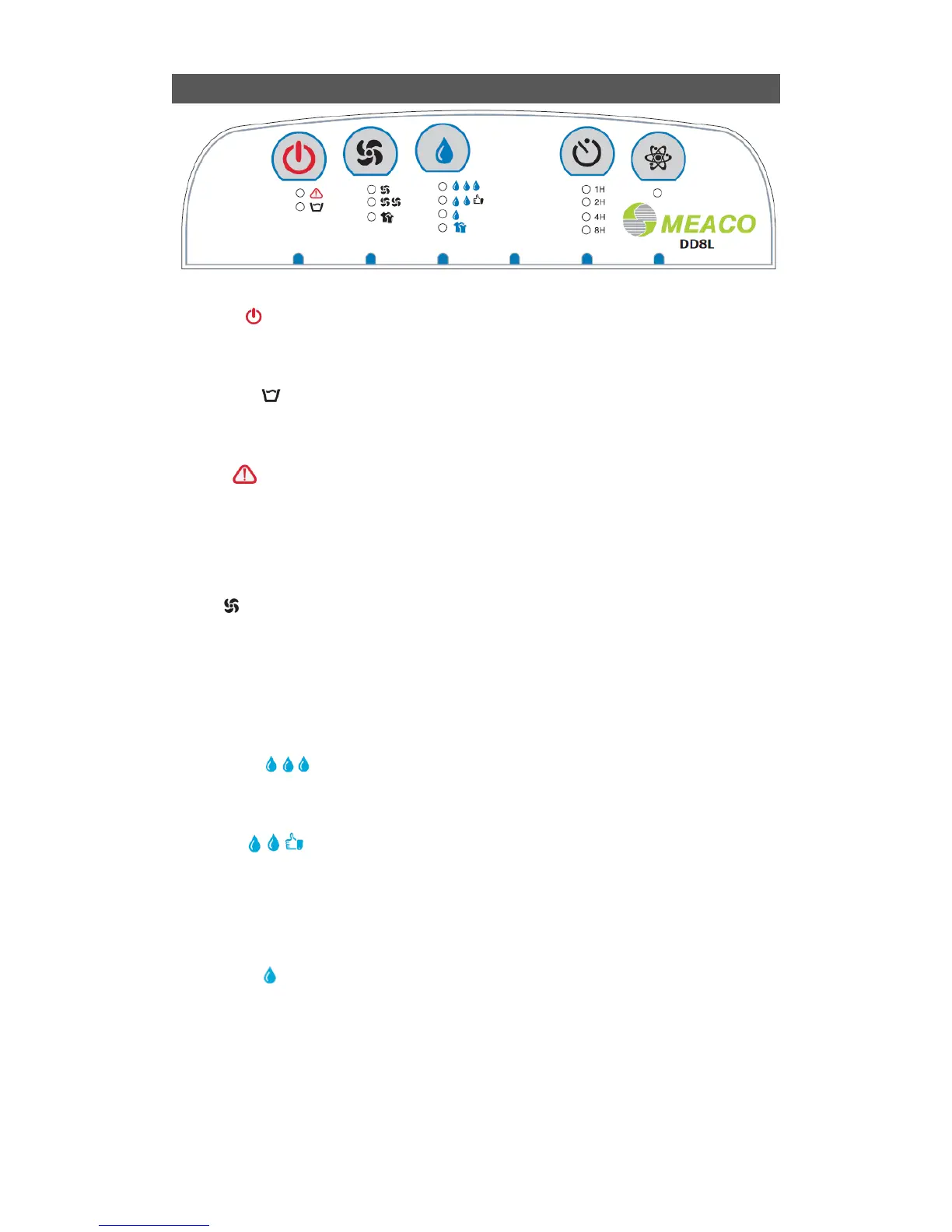 Power - Lights up when there is power to the dehumidifier, the unit bleeps three
