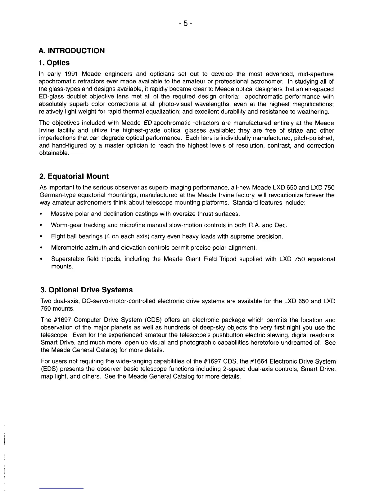 Meade 102ED - Introduction; Optics; Equatorial Mount; Optional Drive Systems