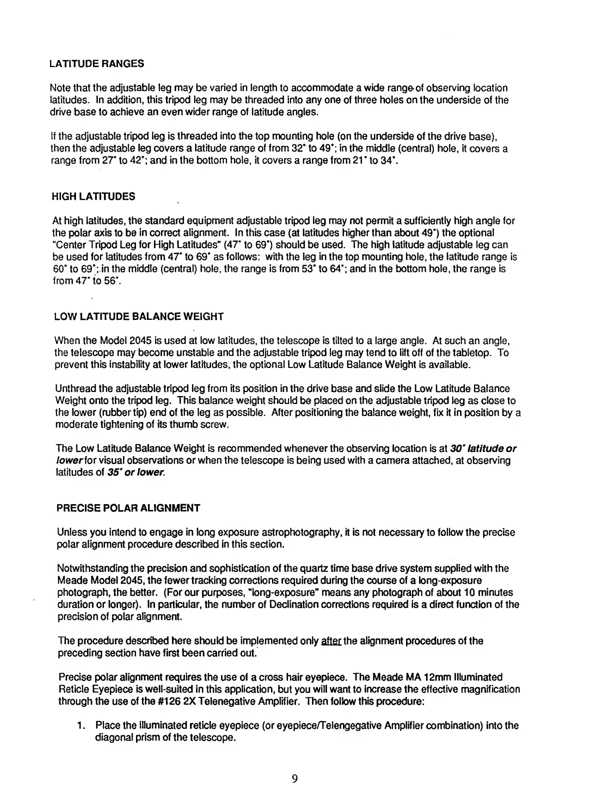 Meade 2045 - Latitude Ranges; High Latitudes; Low Latitude Balance Weight; Precise Polar Alignment