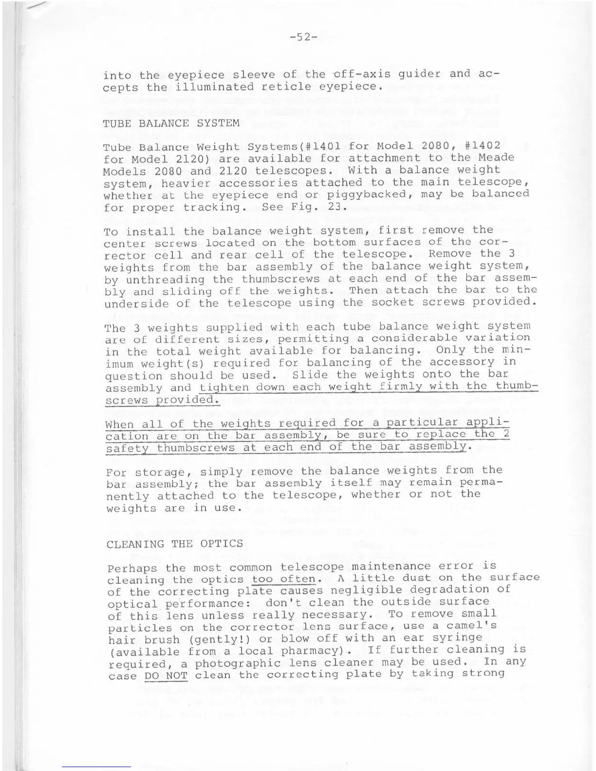 Meade 2120 - Telescope Maintenance and Specifications; Cleaning the Telescope Optics