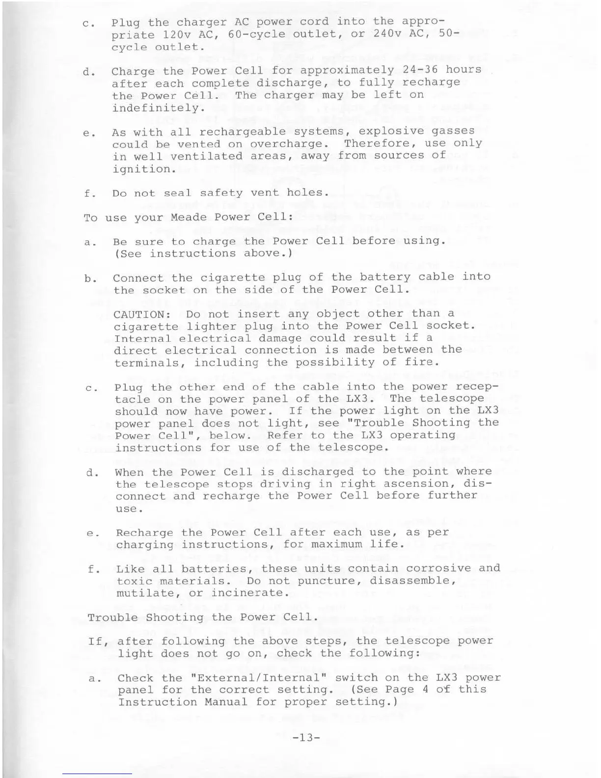 Meade 2120 - To Use Your Meade Power Cell; Trouble Shooting the Power Cell