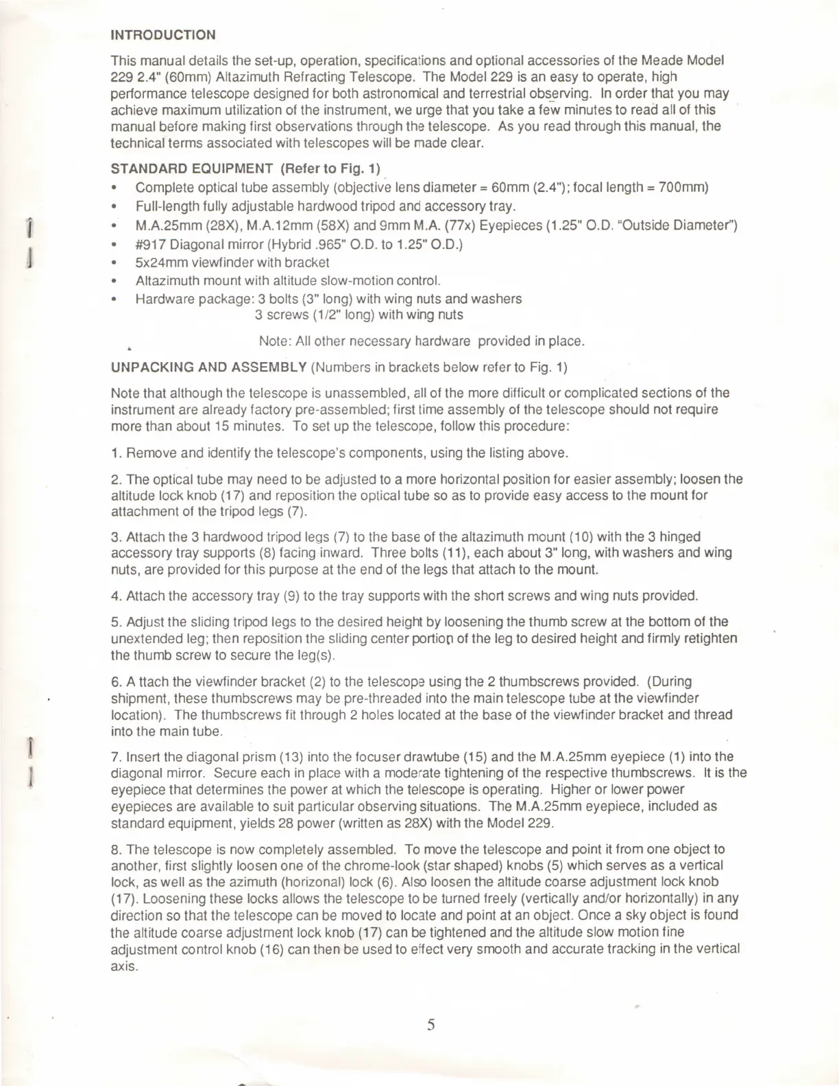 Meade 229 - Introduction to Meade Model 229; Standard Equipment Included; Unpacking and Assembly Guide