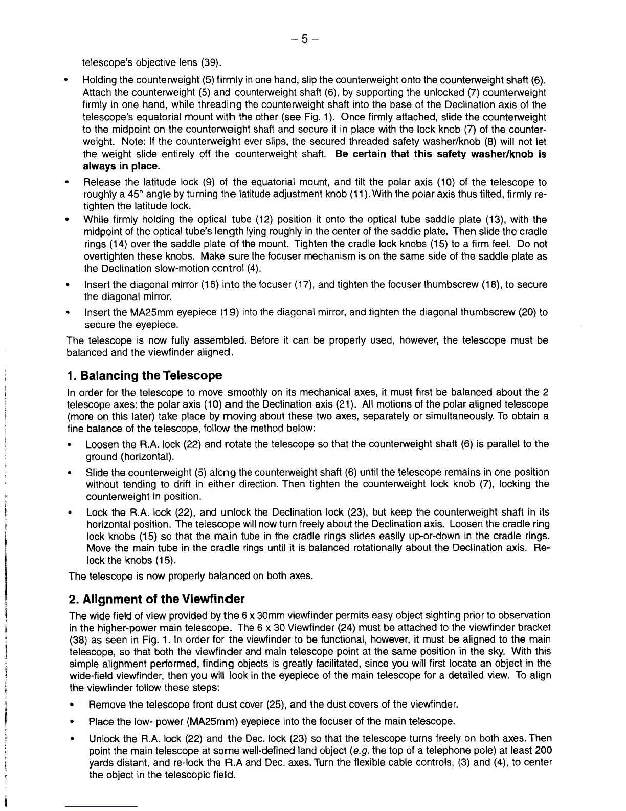 Meade 395 - Telescope Assembly and Balancing; Counterweight and Optical Tube Assembly Installation; Diagonal Mirror and Eyepiece Installation; Balancing the Telescope