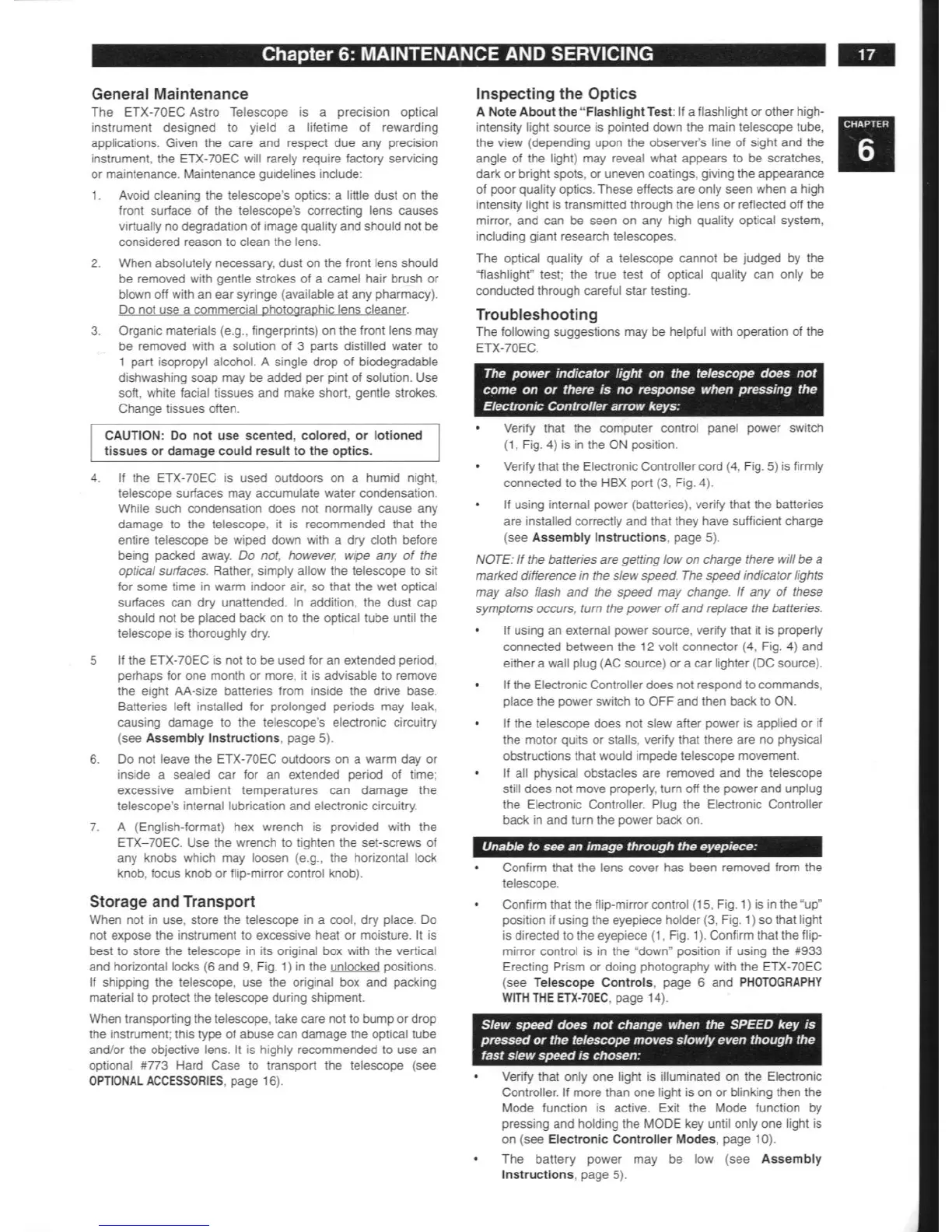 Meade ETX-70EC - Maintenance and Servicing; General Maintenance; Inspecting the Optics; Troubleshooting