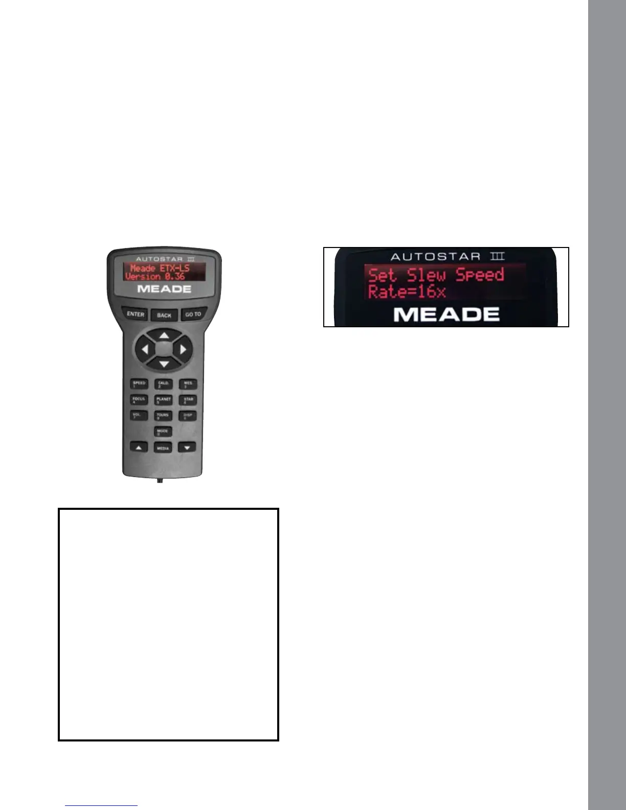 The rst step is to familiarize yourself with the AutoStar III handbox operation. The largest keys on the keypad are