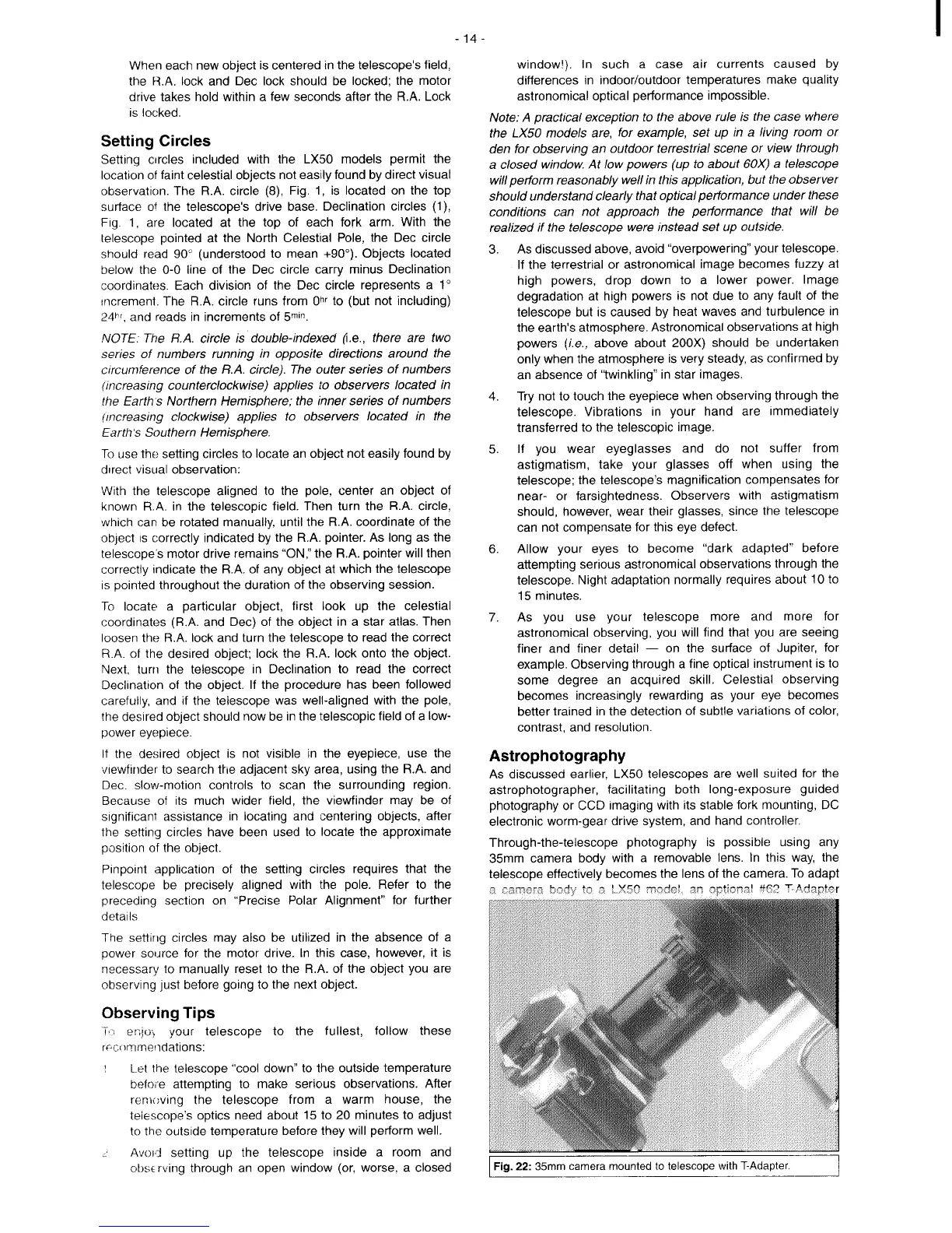 Meade LX50 - Setting Circles; Observing Tips; Astrophotography; 35 Mm Camera Mounted to Telescope with T-Adapter