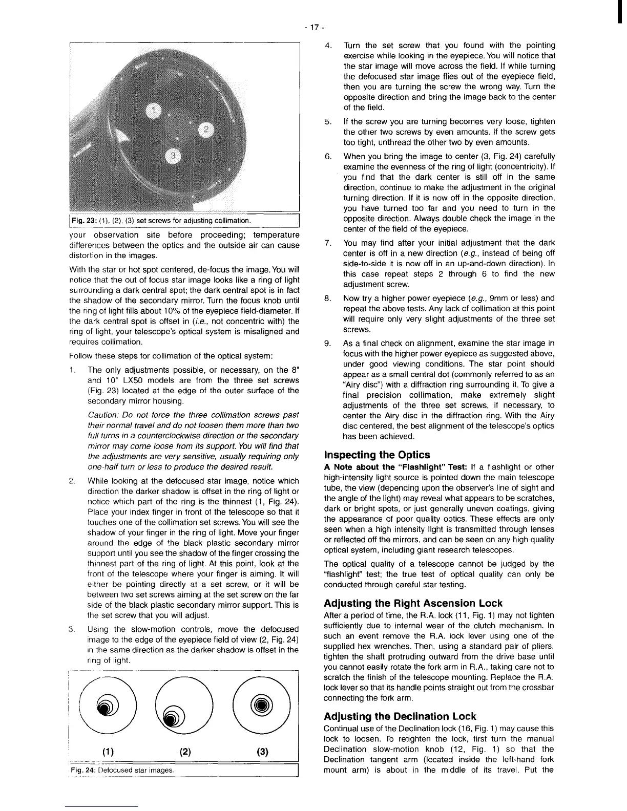 Meade LX50 - Inspecting the Optics; Adjusting the Right Ascension Lock; Adjusting the Declination Lock; Set Screws for Adjusting Collimation