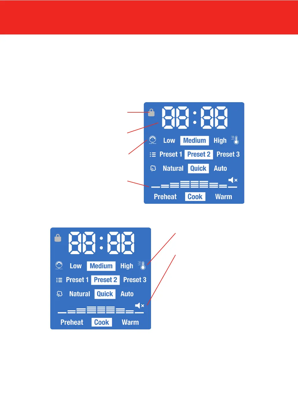 and cooking stages: Preheat, Cook, Warm), and sound status (On/Off).