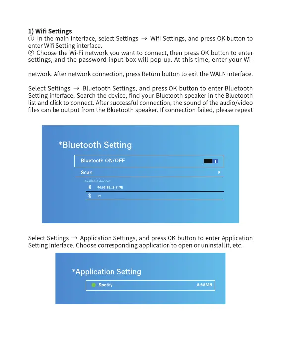 Meauro APT01 - Wifi Settings; Bluetooth Settings; Application Settings