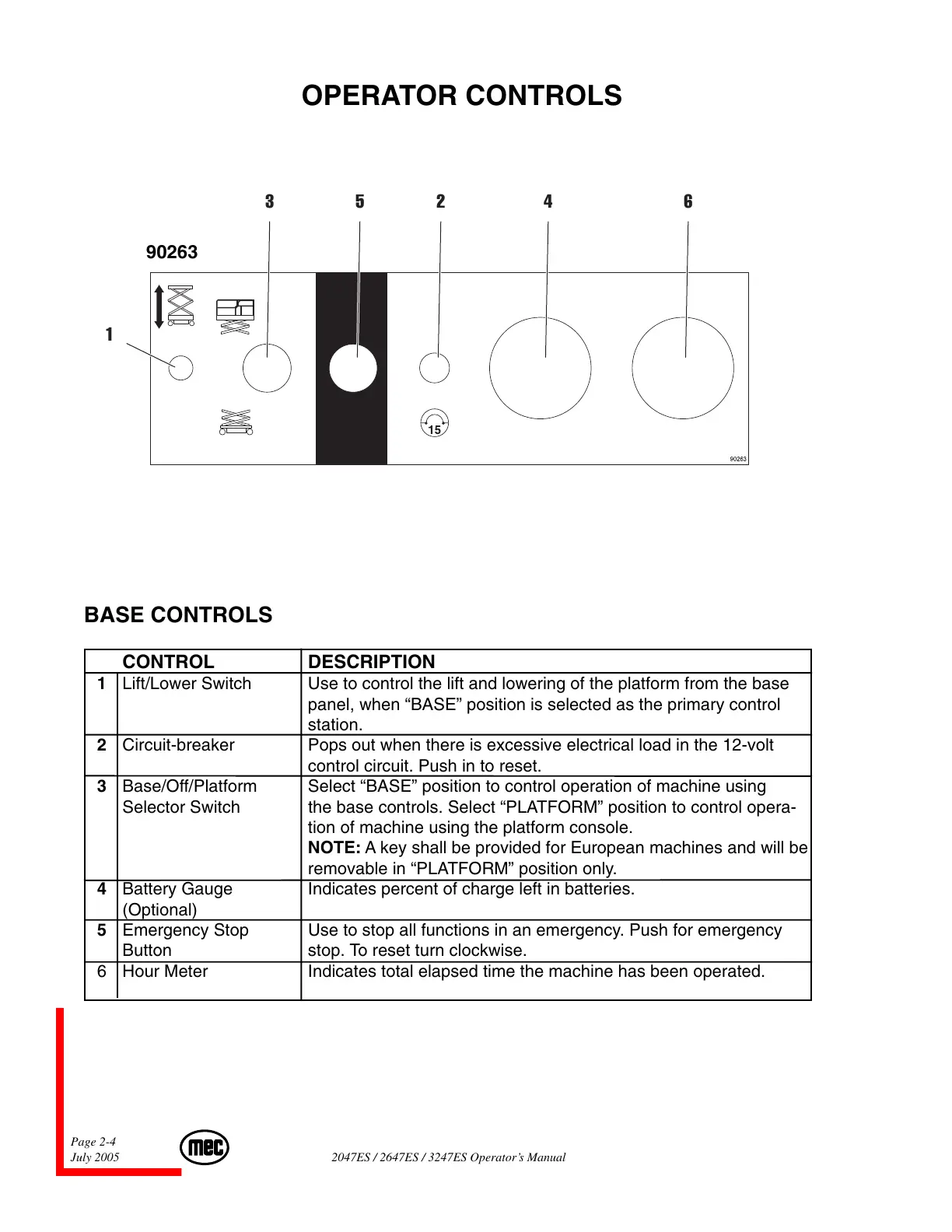 Selector Switch the base controls. Select “PLATFORM” position to control opera-