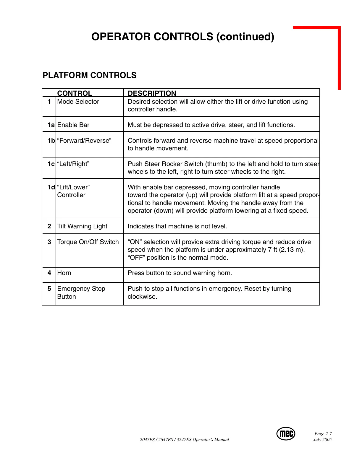 1d “Lift/Lower” With enable bar depressed, moving controller handle
