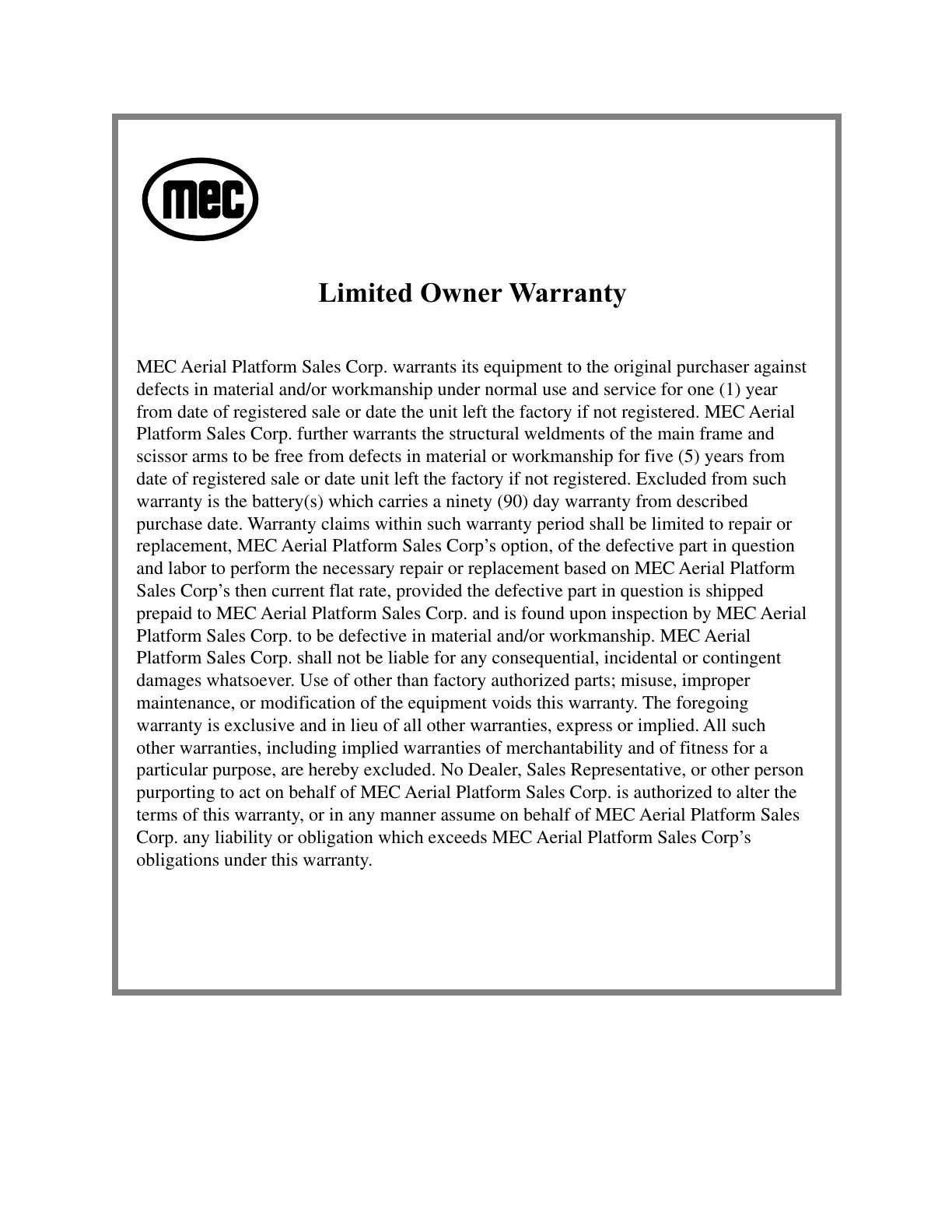 terms of this warranty, or in any manner assume on behalf of MEC Aerial Platform Sales
