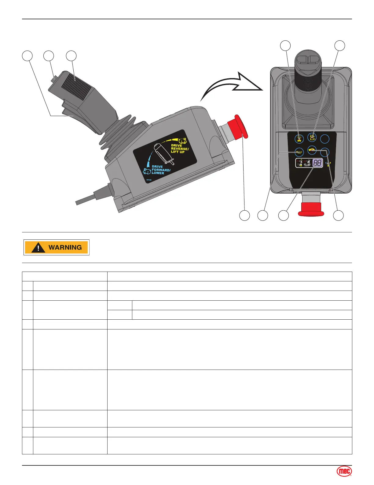 1 Function Enable Switch Squeeze to enable DRIVE, STEER, and LIFT functions from the Control Handle.