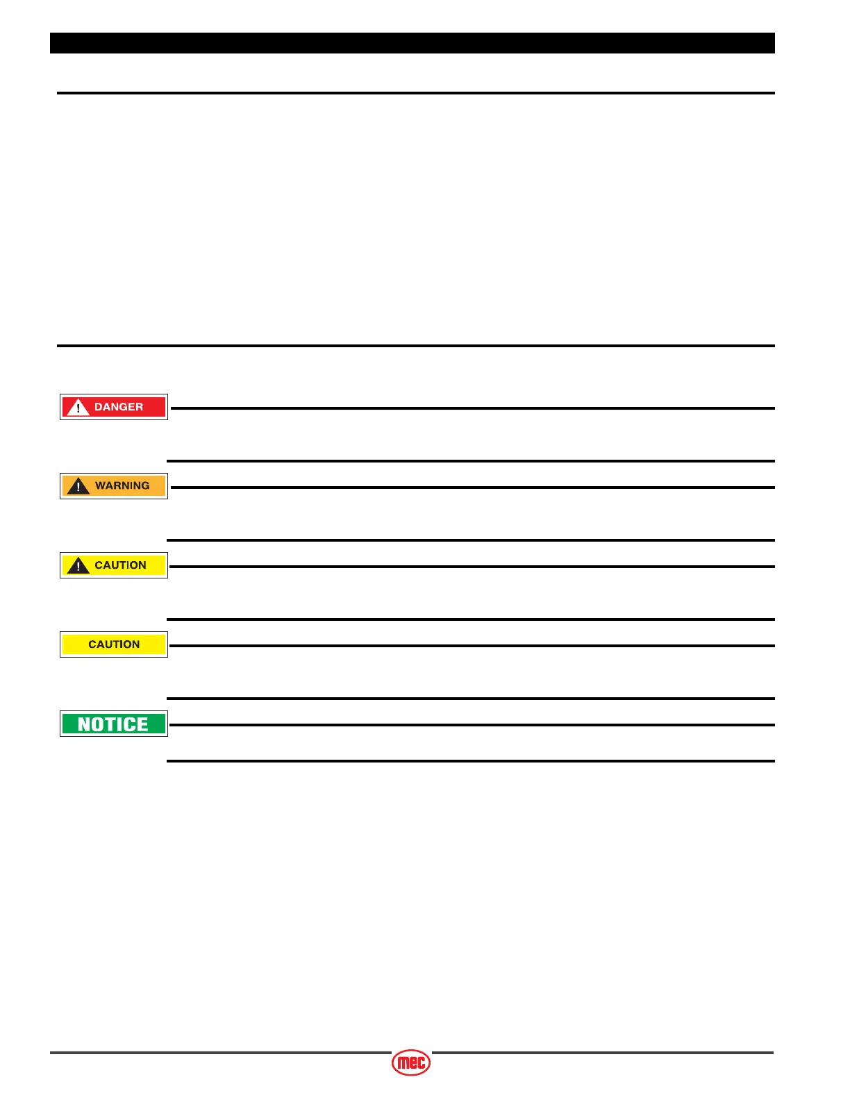 MEC manuals and decals use symbols and colors to help you recognize important safety, operation and maintenance information.