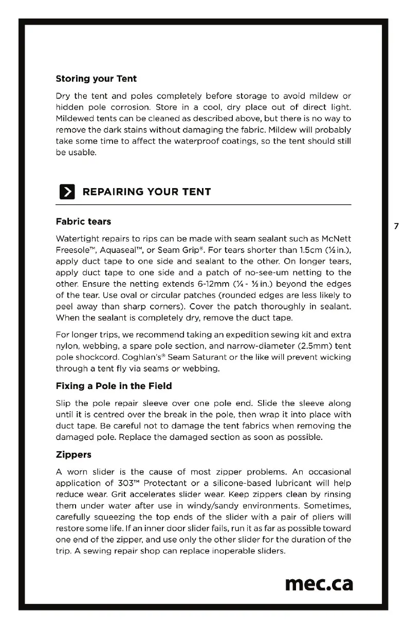 Mec Funhouse 4 - Storing Your Tent; Repairing Your Tent; Fabric Tears; Fixing a Pole in the Field
