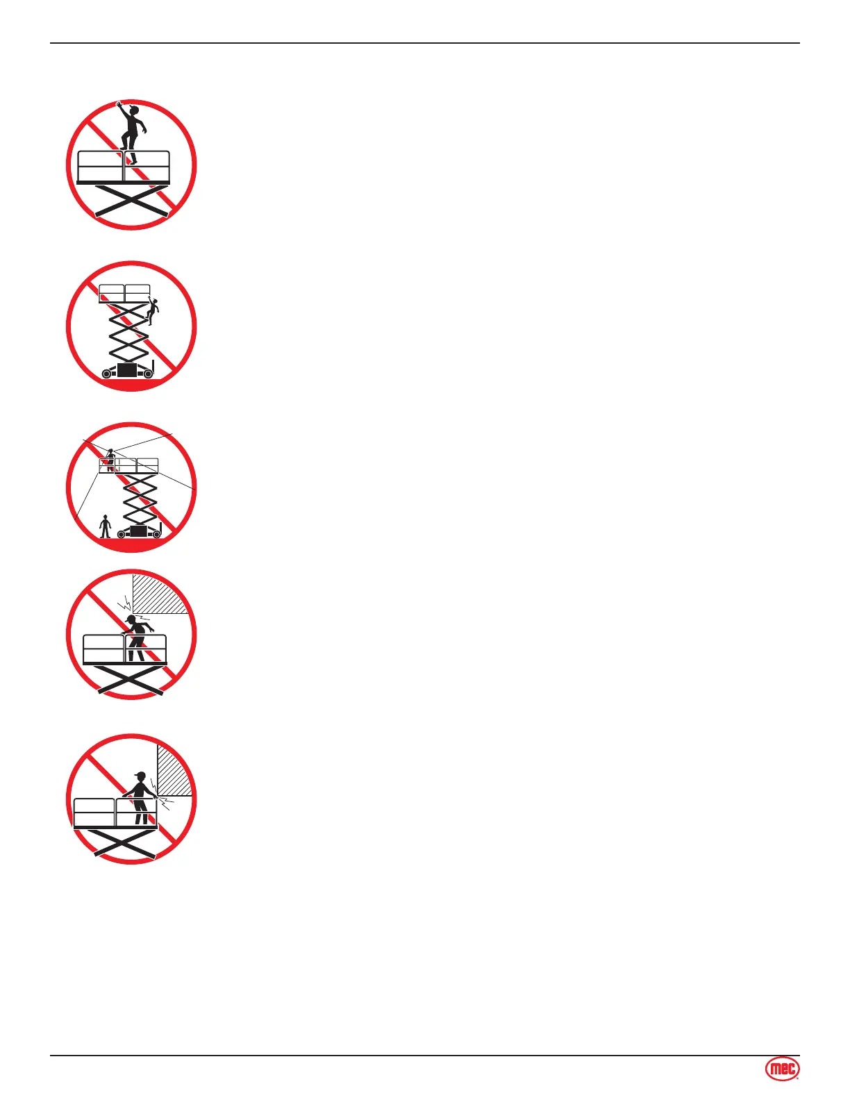 DO NOT exit the platform when elevated. DO NOT climb down from the