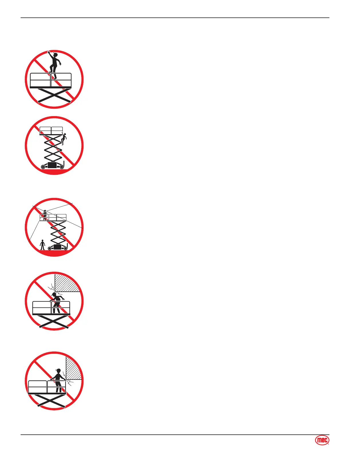 DO NOT sit, stand or climb on the platform guard rails. Maintain a firm footing
