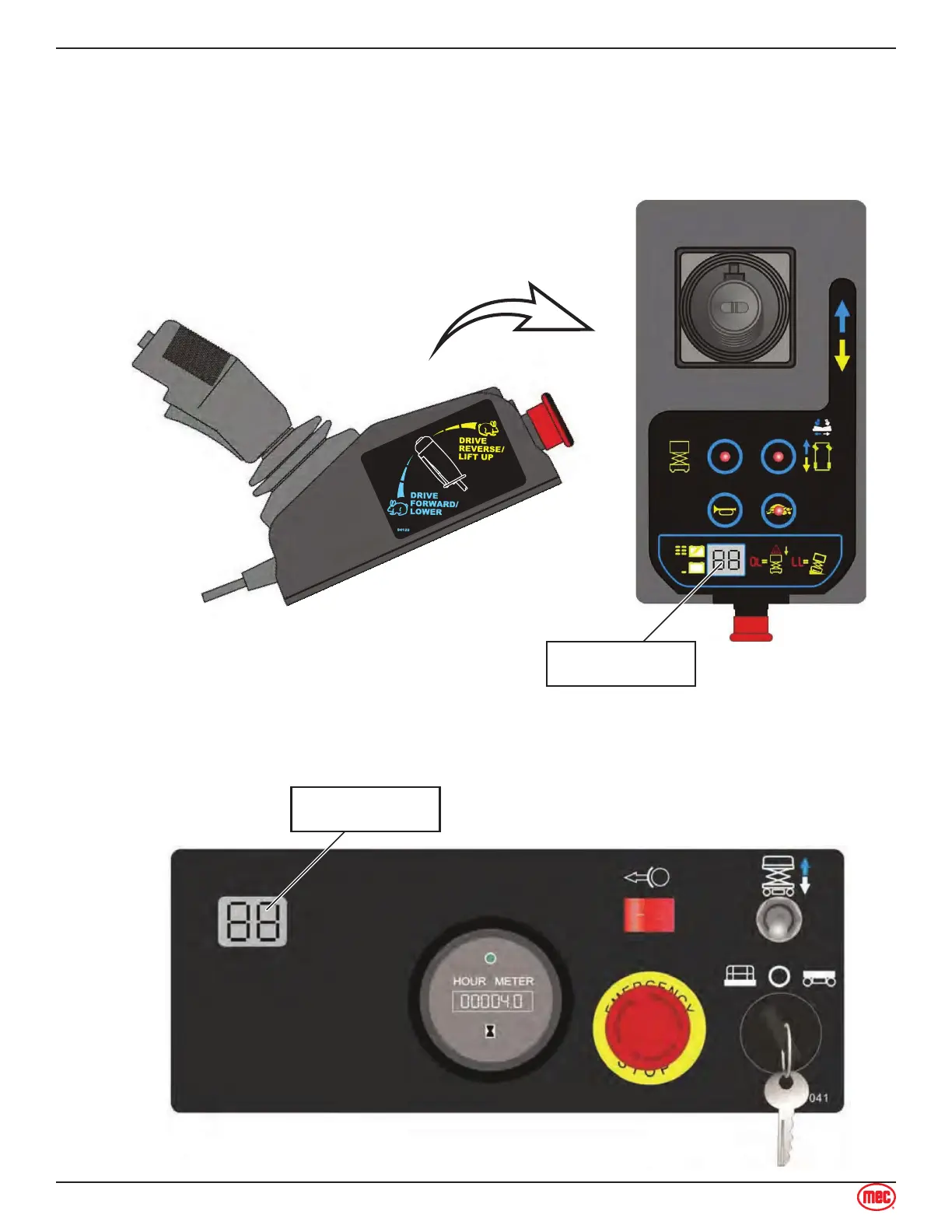 Fault Codes, when present, appear on the LED Indicator at the Upper Controls station and on the