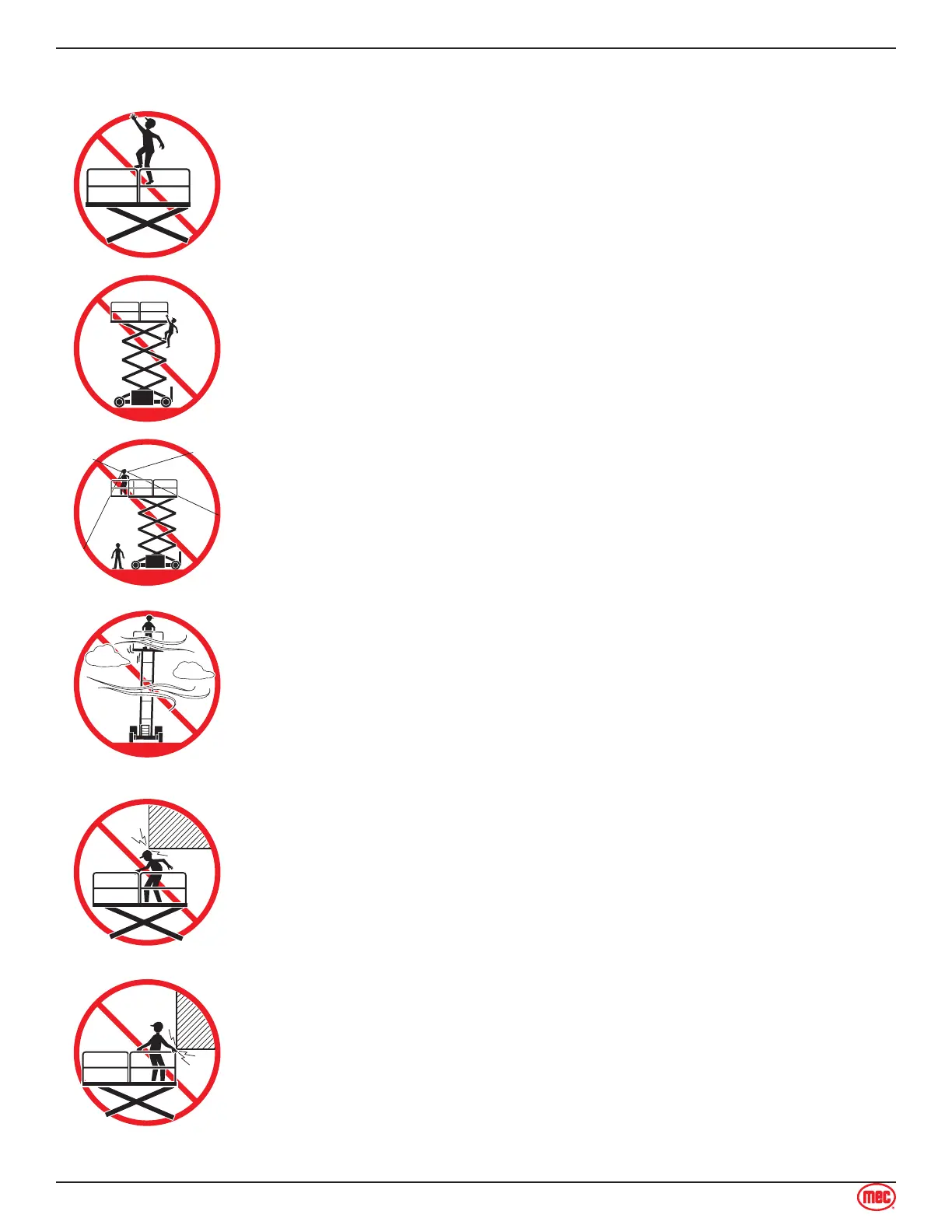 DO NOT exit the platform when elevated. DO NOT climb down from the