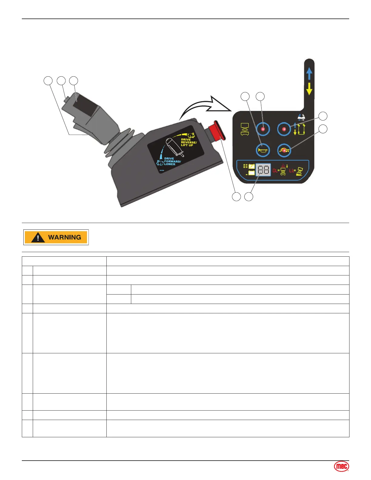 1 Function Enable Switch Squeeze to enable DRIVE, STEER, and LIFT functions from the Control Handle.