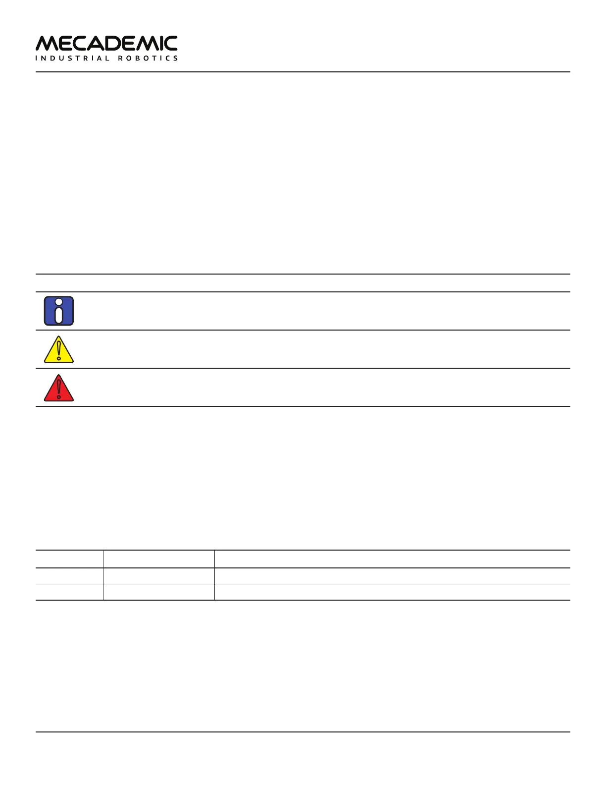 The following table lists the symbols that may be used in Mecademic manuals to denote certain