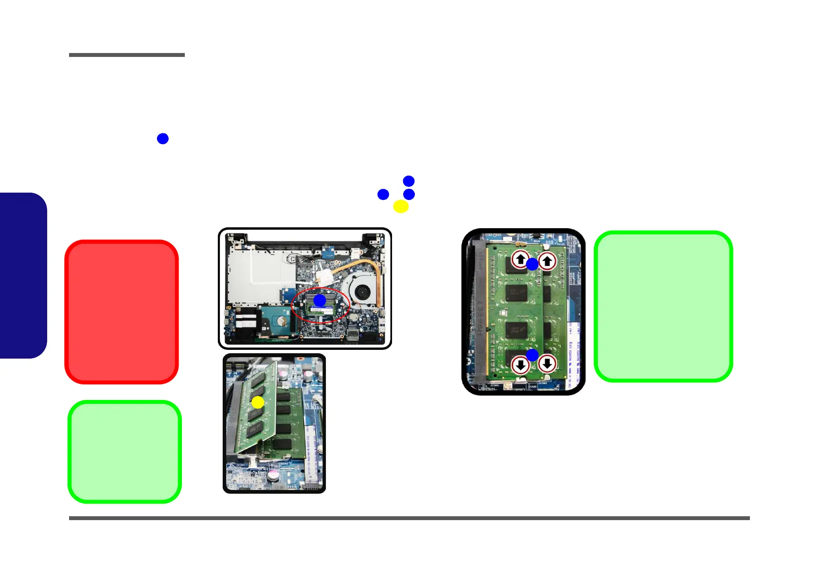 3. Gently pull the two release latches ( & ) on the sides of the memory socket in the direction indicated by the
