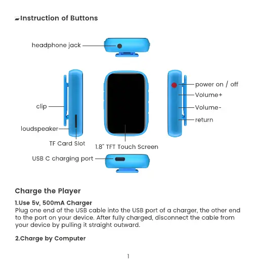 MECHEN D26 - Instruction of Buttons; Device Layout and Controls; Charge the Player; Charging Methods