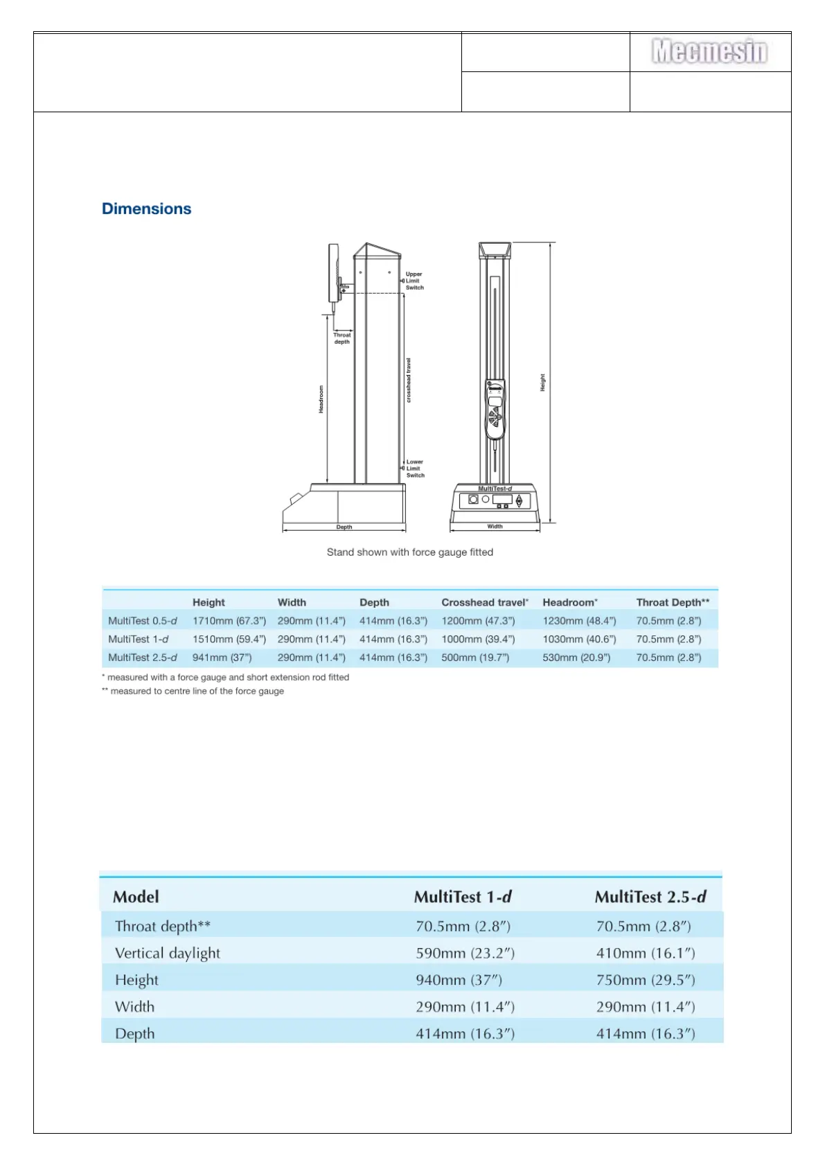 Mecmesin Multitest 0.5d - Dimensions - Mk2 Stand; Dimensions - Mk1 Stand
