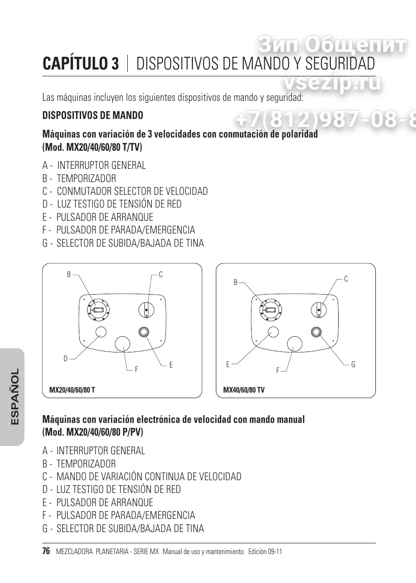 Las máquinas incluyen los siguientes dispositivos de mando y seguridad: