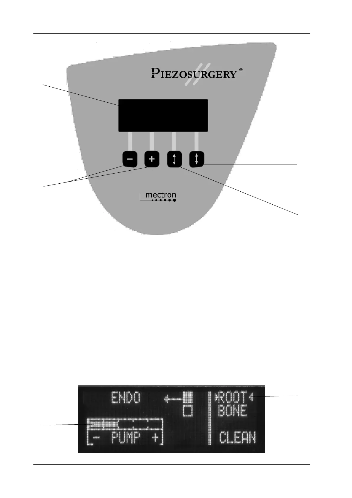 This point describes the three “screens” shown on the Piezosurgery display and their