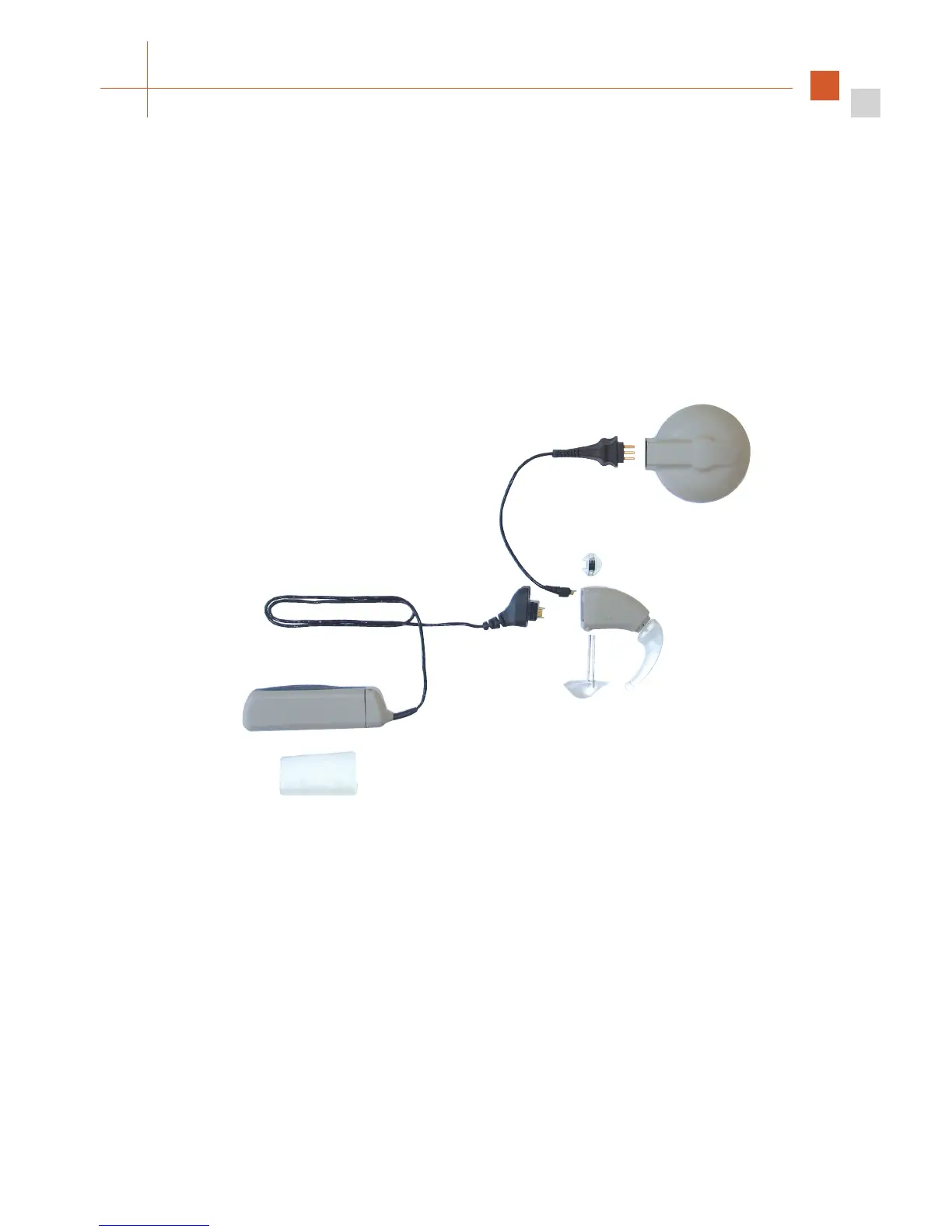 visibility of the red indicator light in the earhook. A cable allows the battery pack to be attached