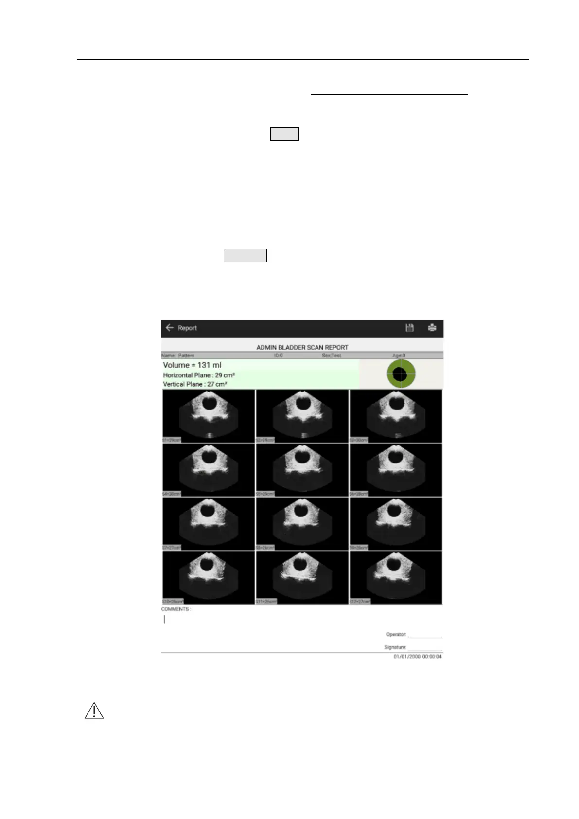 age and ID), measured volume, bladder projection image, report image, comment, operator