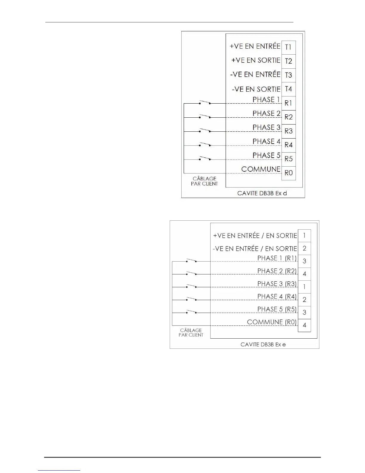 Détails du câblage des versions CC Ex d et Ex de avec activation de la phase hors tension (types 7 et 8)