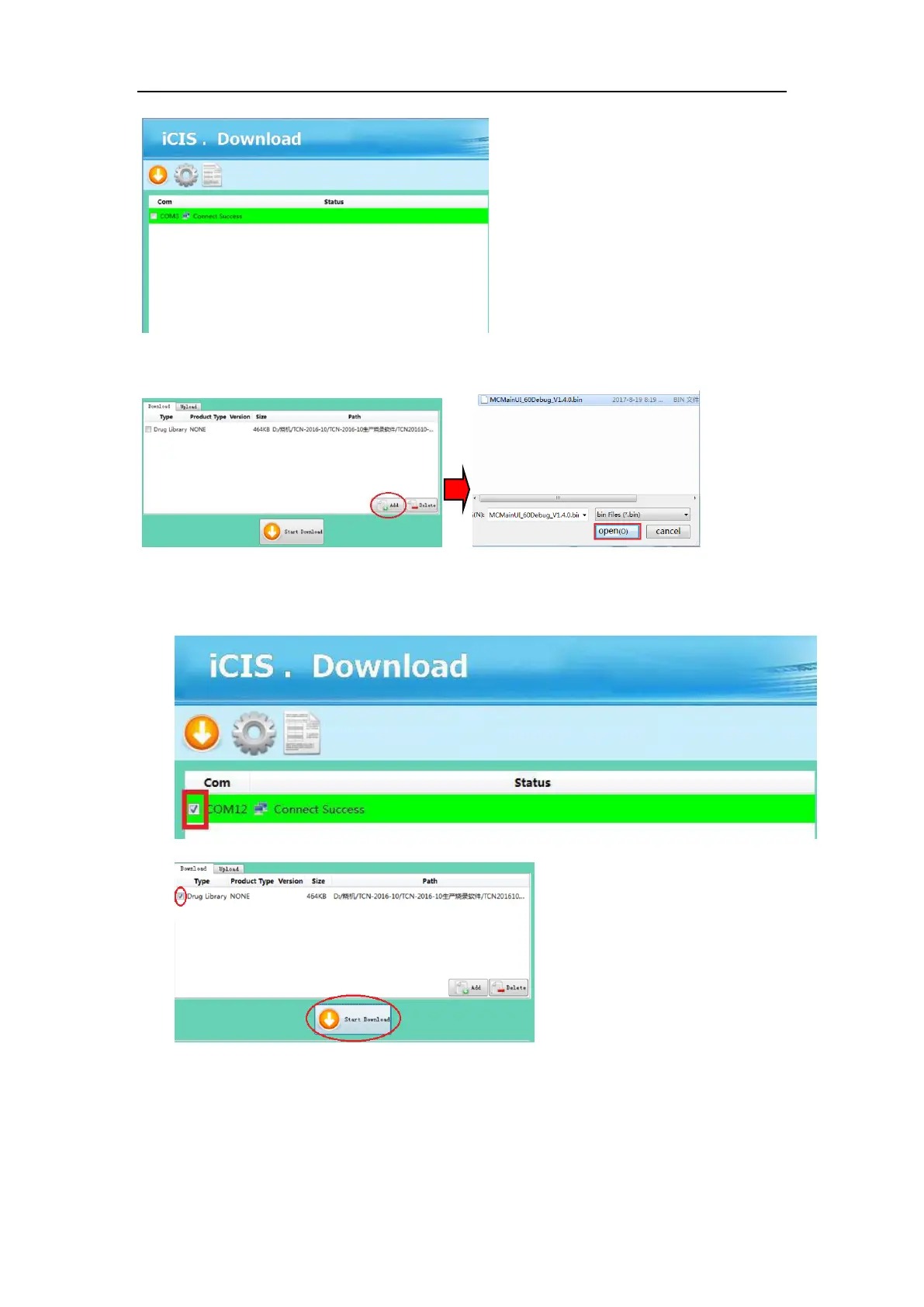 7) Select the port on the left, and select the bin file to be programmed on the right.