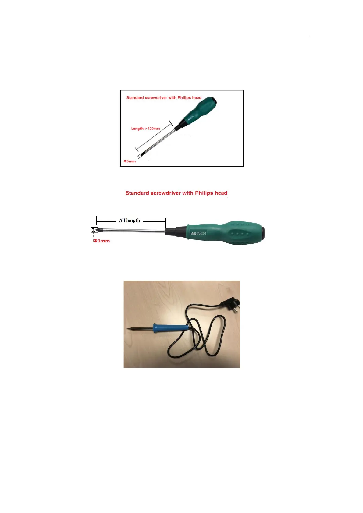 1. Long screwdriver with Philips headDiameter Φ5mm, Length > 120mm.
