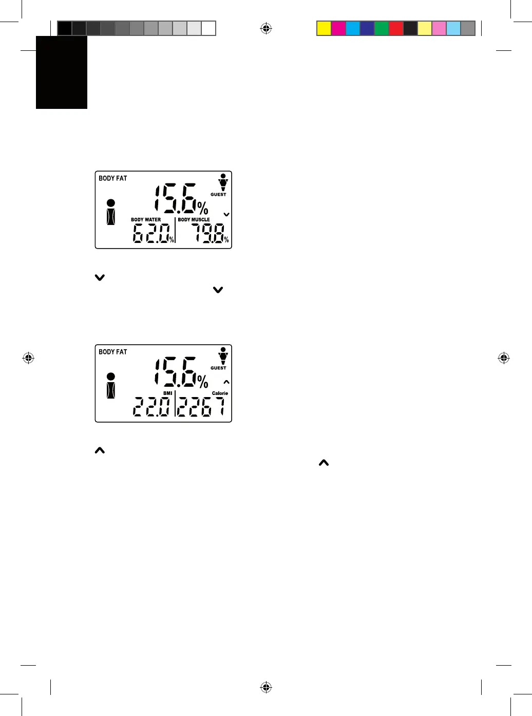 15,6%), água corporal (por ex. 62,0%), massa muscular (por ex. 79,8%).