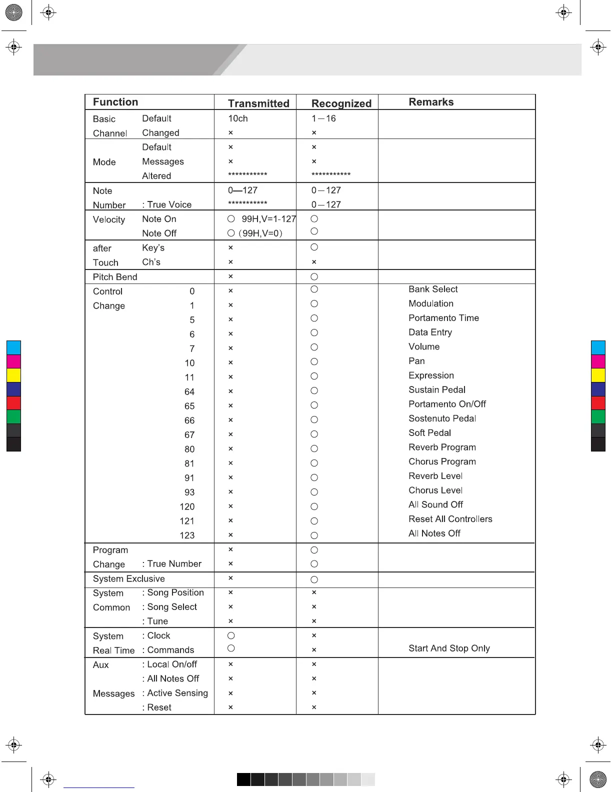MIDI Implementation Chart