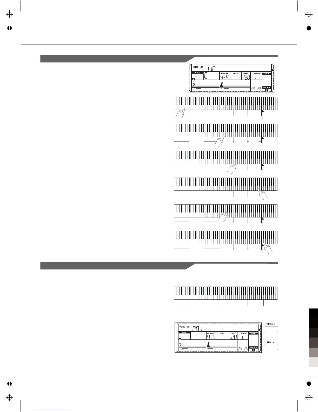 Try to play the white keys in sub area 1, Sub area 2 and Rhythm area,